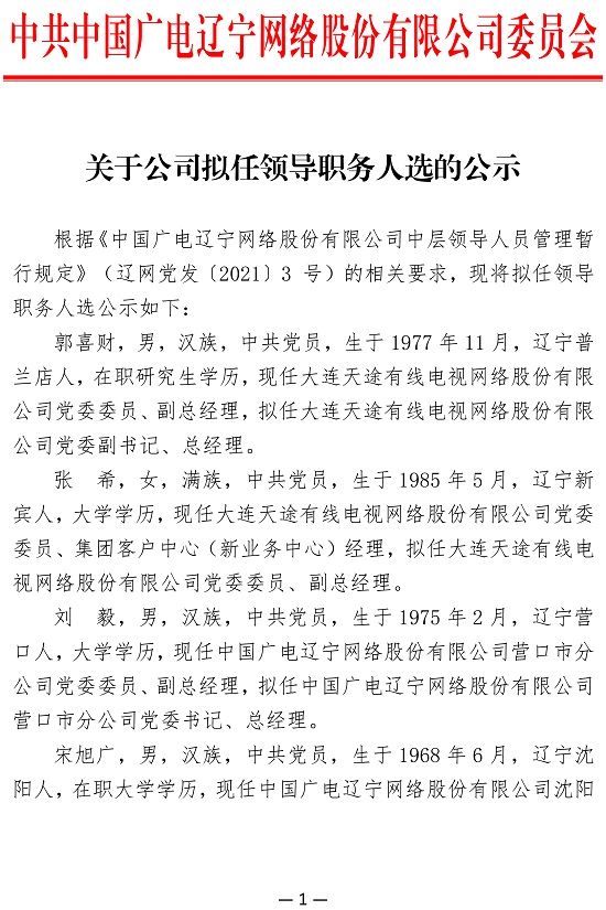 中國廣電遼寧網(wǎng)絡股份有限公司(簡稱中國廣電遼寧公司)前身為成立于2010年2月的北方聯(lián)合廣播電視網(wǎng)絡股份有限公司,系中央國有文化企業(yè)——中國廣電網(wǎng)絡股份有限公司省級子公司、遼寧省國有文化高新技術企業(yè),是按照現(xiàn)代企業(yè)制度打造的集網(wǎng)絡建設、傳輸、運營及多功能開發(fā)與應用為一體綜合網(wǎng)絡運營商。