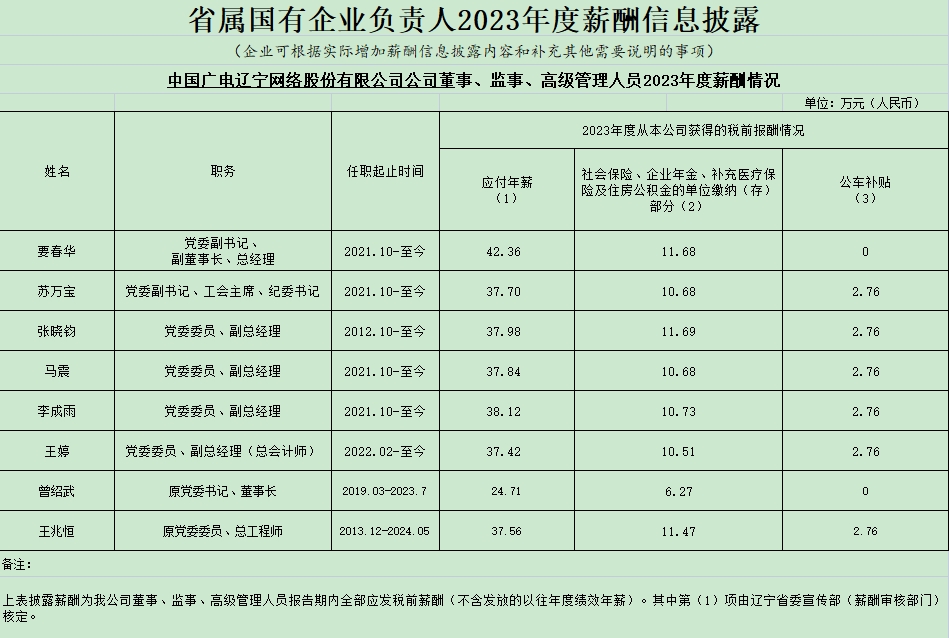 中國廣電遼寧網(wǎng)絡股份有限公司公司董事、監(jiān)事、高級管理人員2023年度薪酬情況